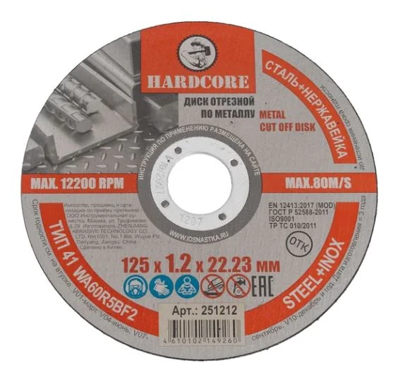 Диск отрезной по металлу нерж. сталь 125х2,5х22,23 мм "Hardcore" /10 шт. уп