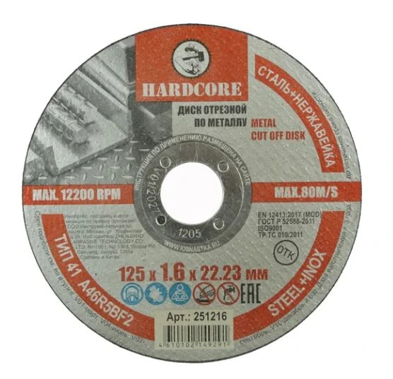 Диск отрезной по металлу нерж. сталь 125х1,6х22,23 мм "Hardcore" /10 шт. уп