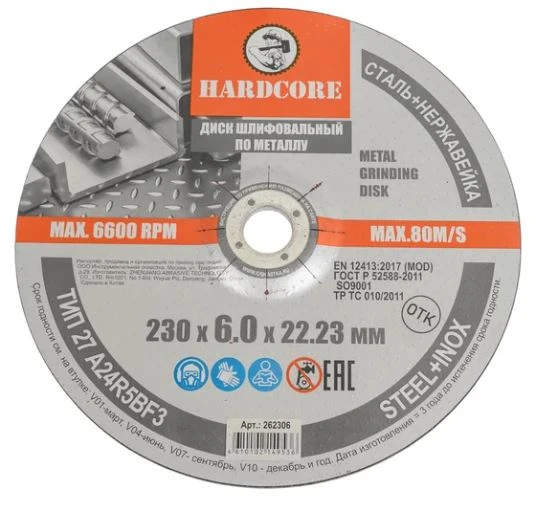 Диск шлифовальный по металлу нерж. сталь 230х6х22,23 мм "Hardcore" /5 шт. уп
