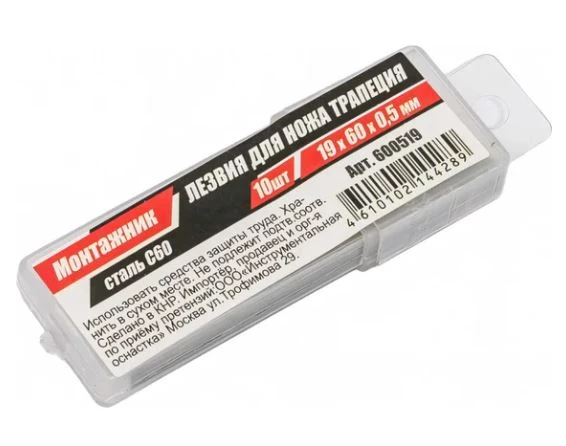 Лезвие 19х60х0,5 мм для ножей трапеция 10 шт. уп "Монтажник"/10 шт