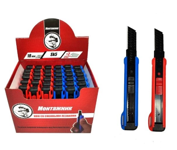 Нож со смен.лезв. 1+2 лезв. SK5 18мм, мет.направл., PP пластик (36 шт/дисплей бокс) "Монтажник"